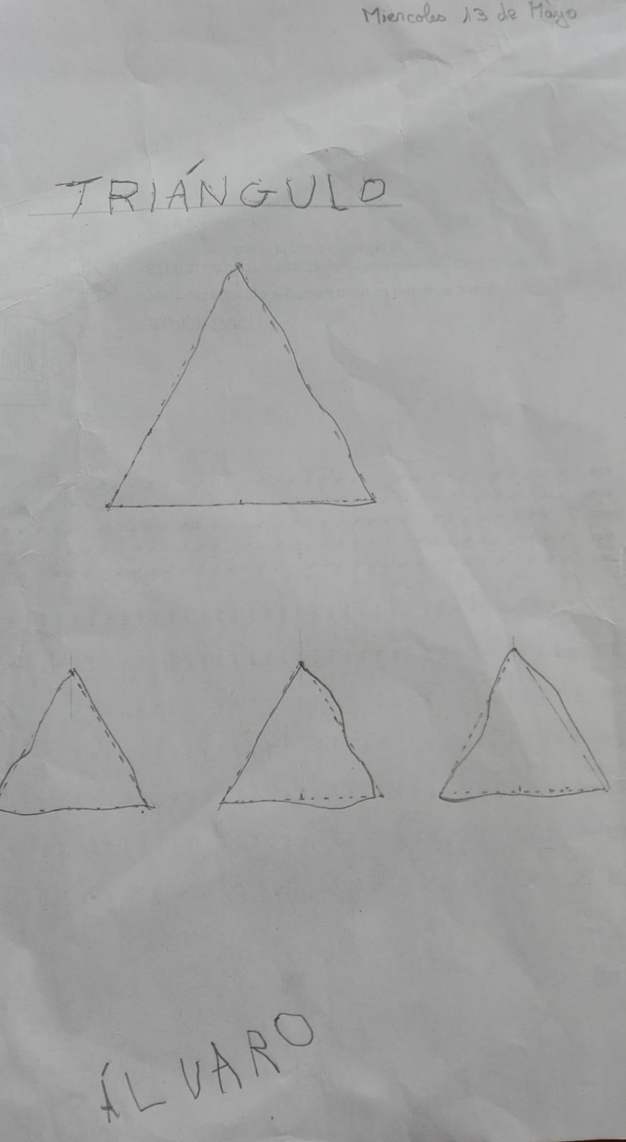 Para comenzar queremos que practiquéis el TRAZO del TRIÁNGULO repasando los puntitos. También tenéis que repasar la palabra triángulo y decirle a un adulto las letras que conocéis dentro de esta palabra. Recordad que para hacer un buen triángulo hay que empezar por el vértice superior, ir hacia abajo con una línea inclinada hasta otro vértice, repetir lo mismo con el otro lado y finalmente cerrar la figura con una línea.